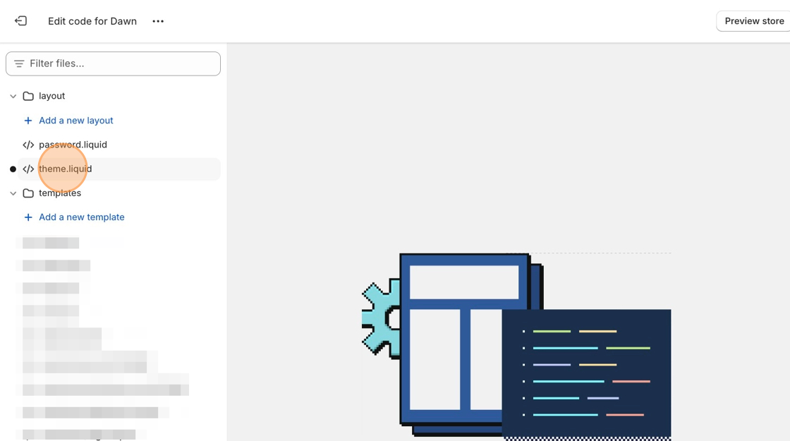 1\. On the left side, under the **Layout** heading, click on the **theme.liquid** file.