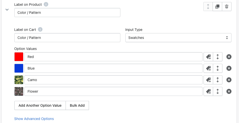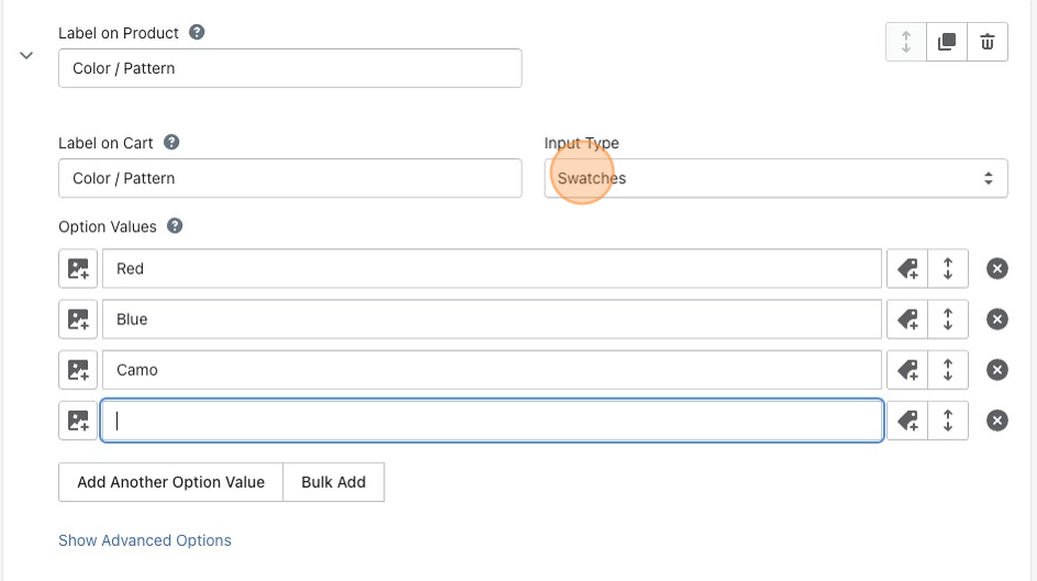 2\. In your first option field, select **Swatches** as the input type. Then, type in your **Option Values**.