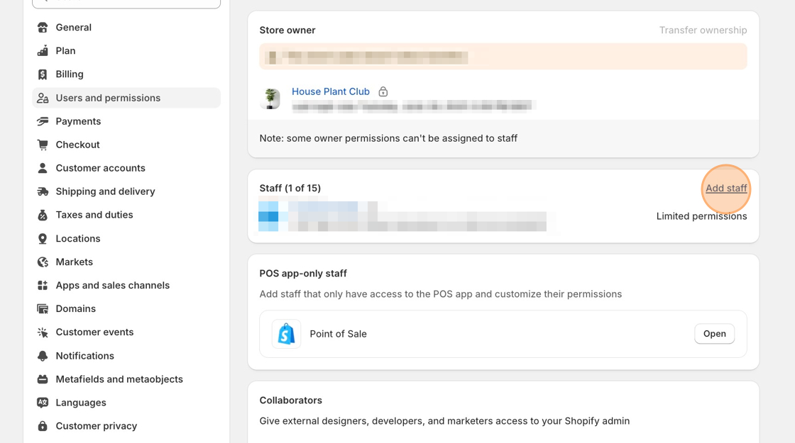 4\.  Locate the **Staff accounts** section, then click **Add staff**.