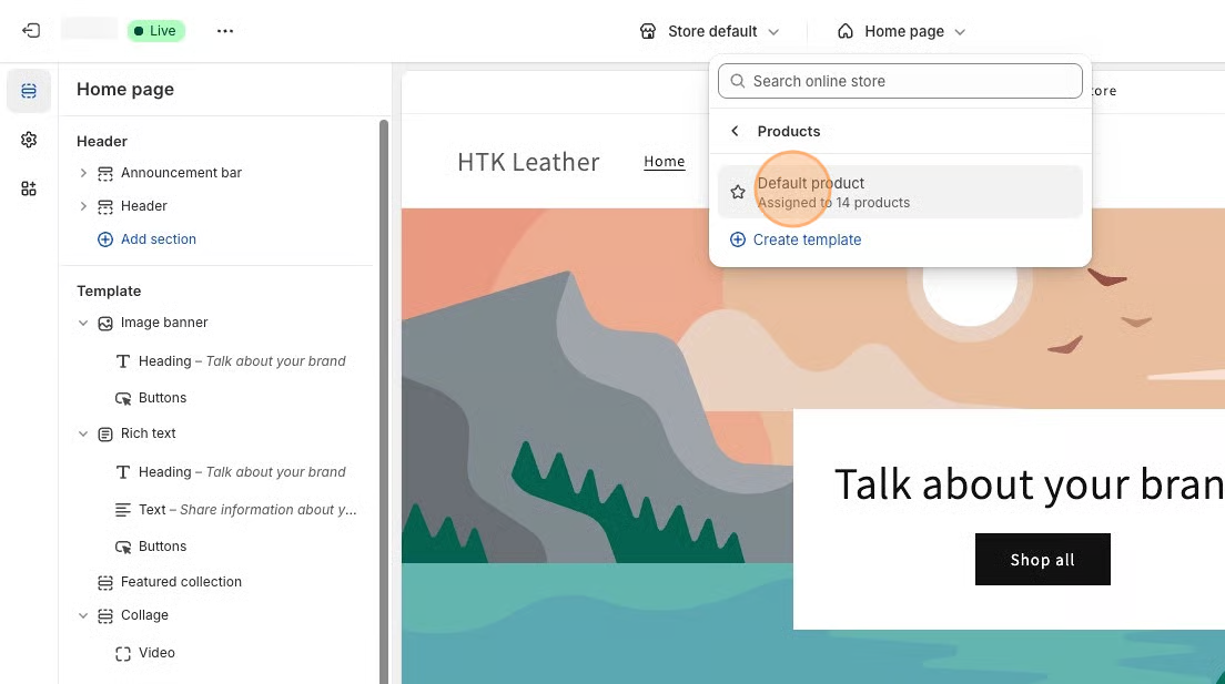 3\. Select **Products** from the dropdown menu in the header and then select a product template. **Default product** is the standard template for Refresh theme.