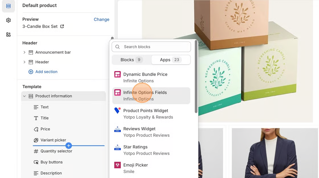 4\. In the **Product Information** section of the left-hand toolbar, hover below **Variant picker**, click the + symbol, then select the **Infinite Options Fields** block in Apps.
