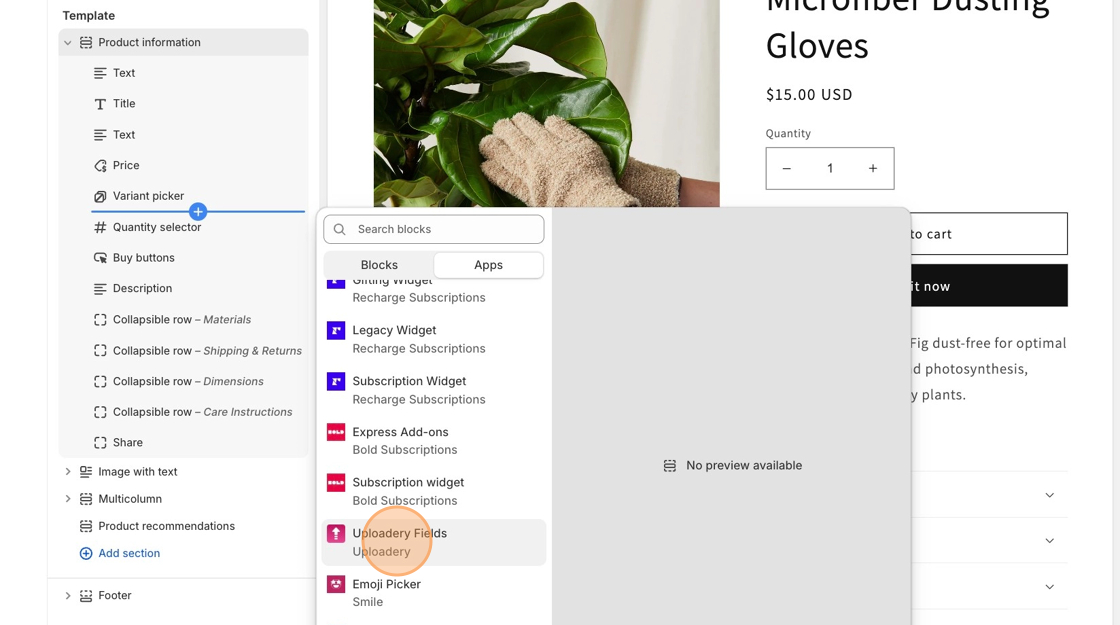 4. Locate a section for product information in the left-hand toolbar. Then, hover below the variant picker, click + **Add block**, then select the **Uploadery** block on the Apps tab. *If the block does not appear, then you are not using a 2.0 theme.*