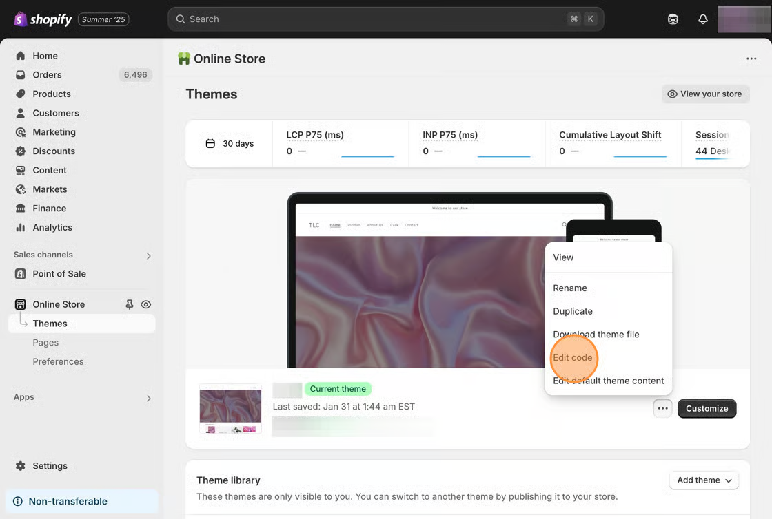 2\. Click the **Actions** button, then select **Edit code**.