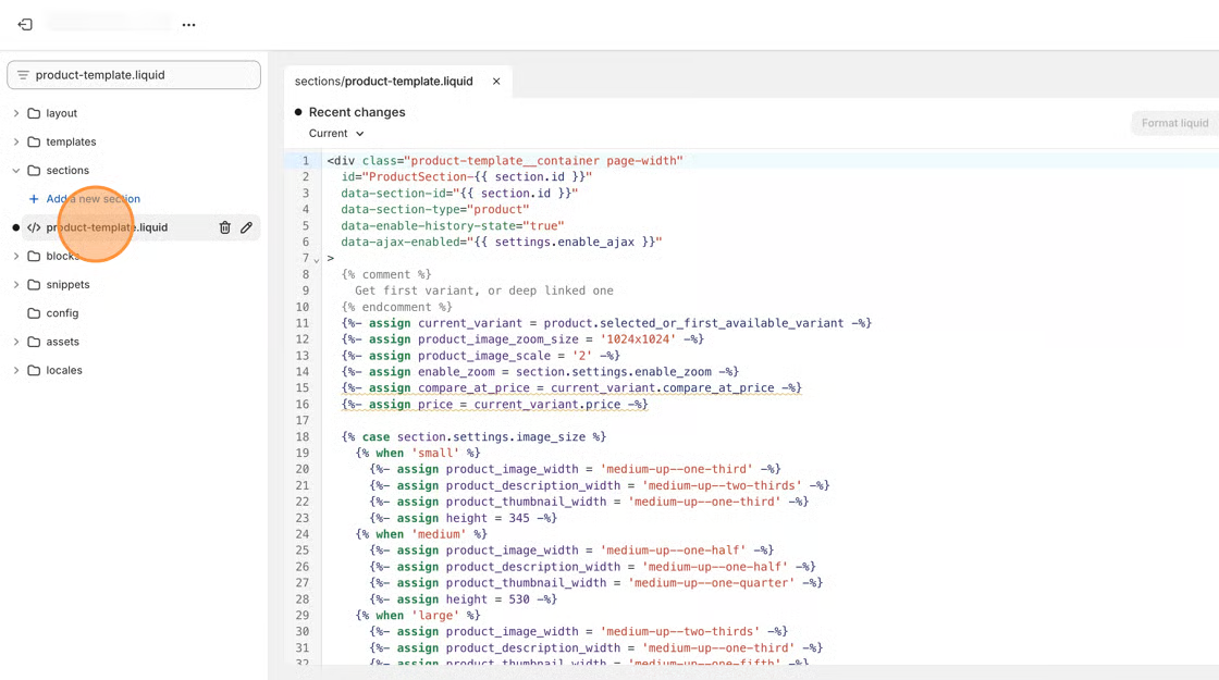 3\. Use the search bar located in the top left of the code editor to search for your **product-template.liquid** file.