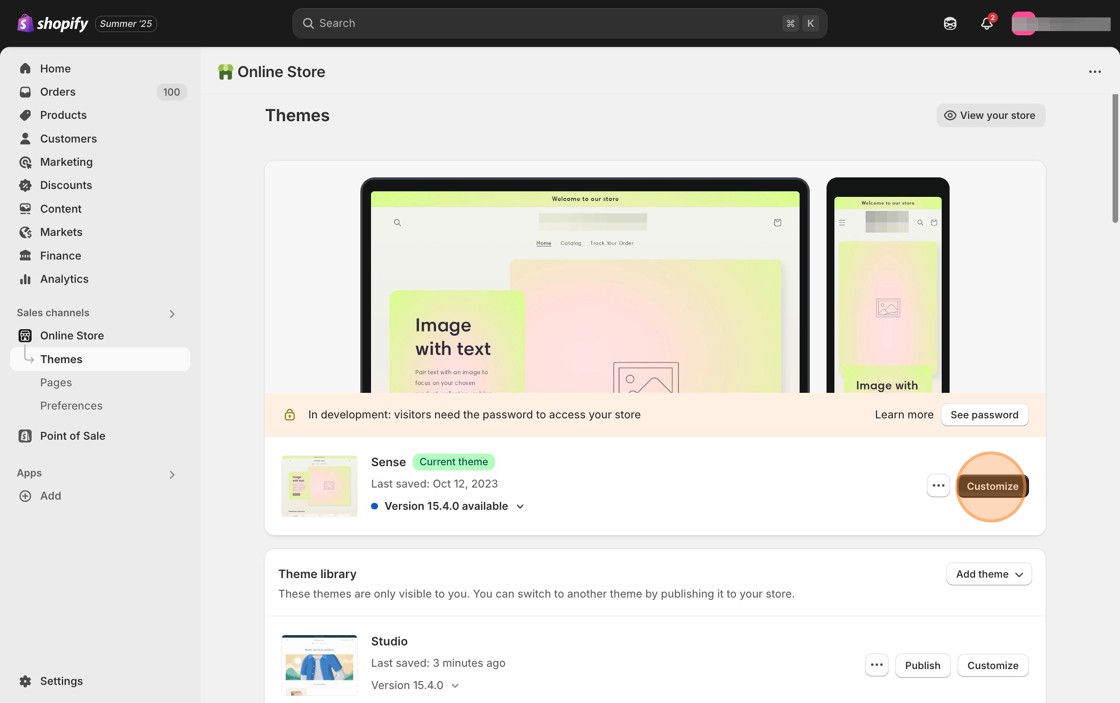 2\. Click the **Customize** button on the **Sense** theme.