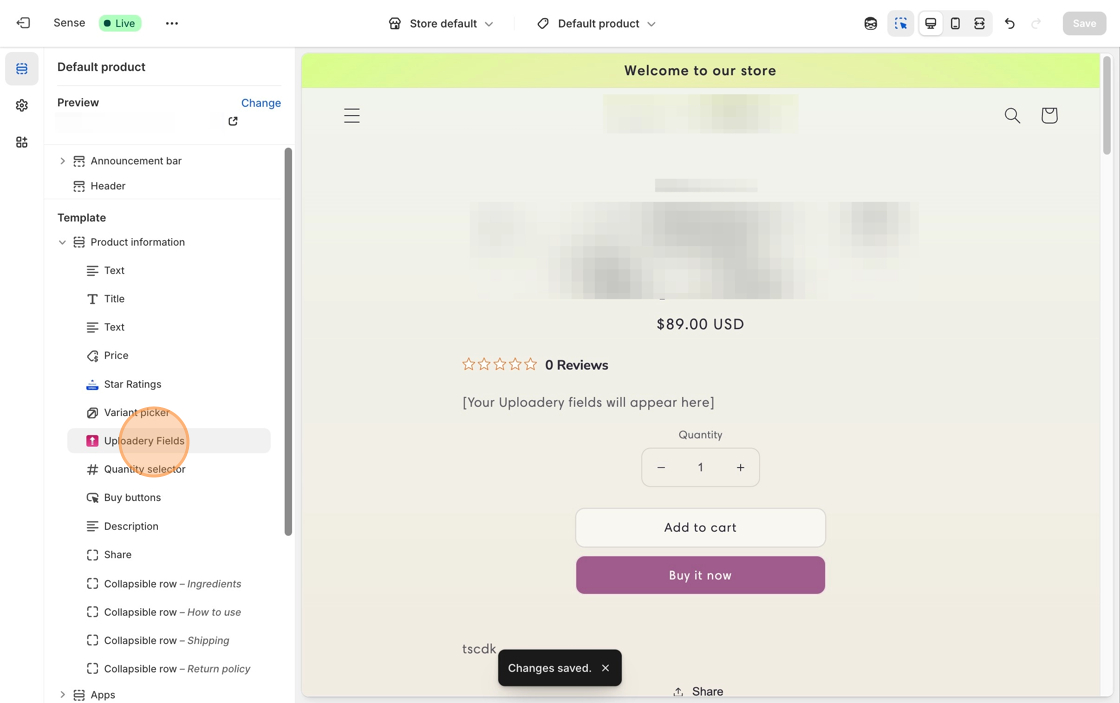5\. Move the **Uploadery Fields** block above the **Quantity selector** block, or the **Buy buttons** block.